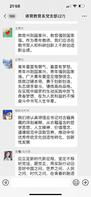 2022年5月5日体育教育系全体党员教师通过腾讯会议共同学习习近平总书记在中国人民大学考察时的重要讲话。习近平总书记代表党中央,向全国各族青年致以节日的祝贺,向中国人民大学全体师生员工、向全国广大教育工作者和青年工作者致以诚挚的问候。习近平希望全国广大青年牢记党的教诲,立志民族复兴,不负韶华,不负时代,不负人民,在青春的赛道上奋力奔跑,争取跑出当代青年的最好成绩!作为新时代的高校教育工作者,我们一定要立足新时代新征程,传承红色基因扎根中国大地,在实现中华民族伟大复兴的时代洪流中踔厉奋发、勇毅前进。