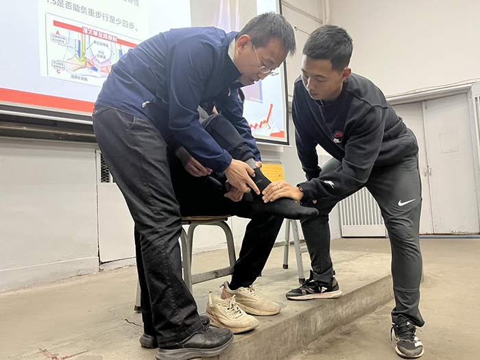 在理论讲解环节,吕文科医生通过丰富的临床诊疗经验与国家队保障经历,构建起“生理结构-损伤机理-分级处置-康复训练”的完整知识体系。他通过解剖模型演示与动态示意图解析,直观呈现膝关节复杂结构特点,明确指出“高强度训练中膝关节承受压力可达体重3-5倍”的核心风险点,详细区分前交叉韧带损伤、半月板损伤等常见膝伤的诱因与症状差异,为学子建立科学认知基础。针对肌肉拉伤等突发状况,吕医生重点传授“PRICE原则”(保护、休息、冰敷、加压、抬高)的实操规范,强调“动态拉伸激活肌肉”的赛前防护关键环节,纠正传统训练中的认知误区。