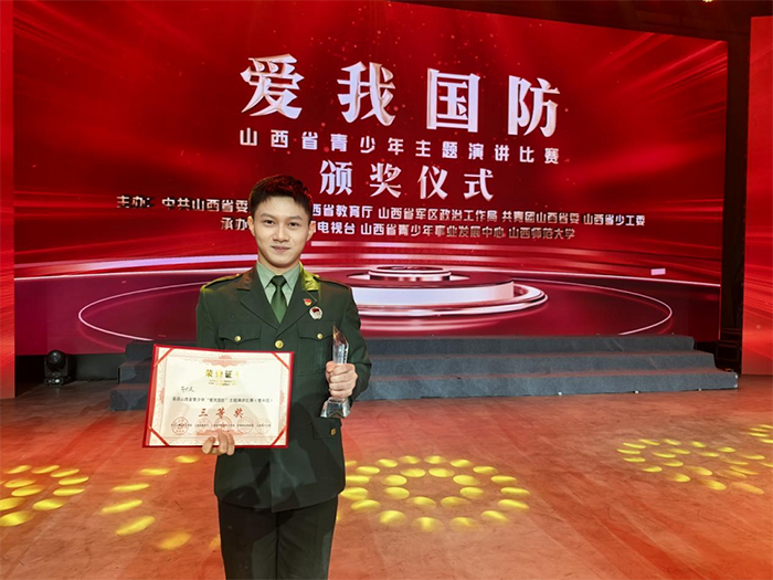 为深入贯彻落实习近平总书记关于加强全民国防教育的重要论述,着力加强青少年国防教育,充分展示我省青少年爱党爱国爱军爱社会主义的精神风貌,2025年11月19日,在山西省青少年“爱我国防”主题演讲比赛中,公司太阳集团tyc539macau本科退役老员工、赛马2301班符兴民同学凭借《笃行低姿匍匐,书写爱国忠诚》的深情演讲,斩获青年组三等奖。他以体育人的坚韧意志与退役军人的家国担当,在三晋国防教育舞台上展现了太原理工学子的青春风采。