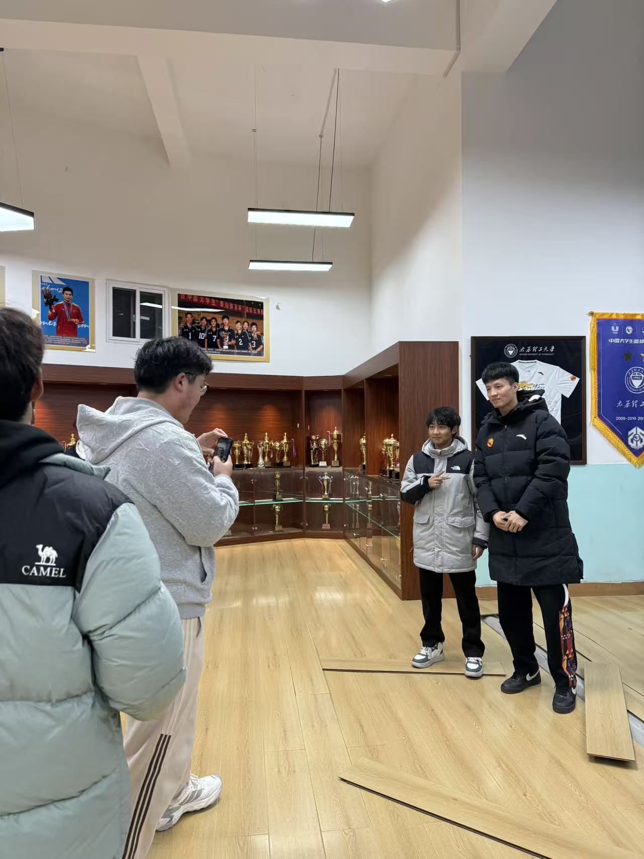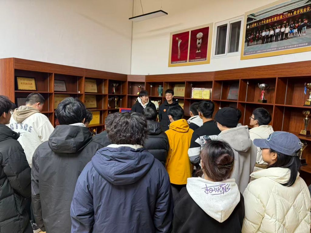 在参观过程中,两位男篮队员结合自身成长经历,分享了在刻苦训练、团队协作、伤病恢复、心理调适等方面的亲身感悟,强调每一次赛场表现背后都是对公司荣誉的坚守、对团队责任的担当和对自我极限的突破。同学们认真聆听、驻足交流,在“看得见、摸得着”的沉浸式实践场景中产生强烈内心共鸣。