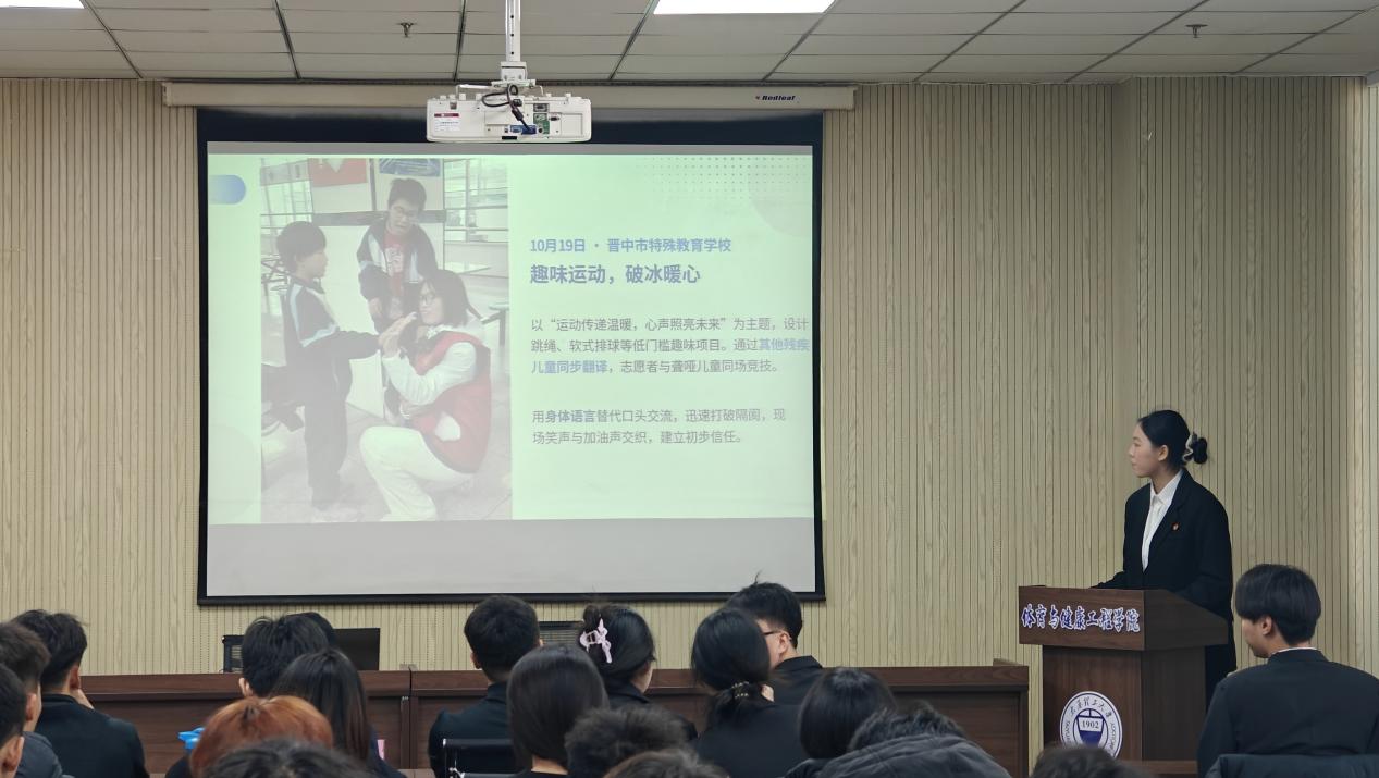 青山志愿者服务队副队长张辉聚焦志愿服务工作成效,重点汇报晋中市特殊教育公司趣味运动陪伴、"爱心包裹"公益募捐、国际志愿者日乒乓球接力等品牌活动,同时她在总结中指出,希望我们能够在今后的生活中积极投身志愿服务,为体育事业奉献青春力量,推动我们太阳集团tyc539macau志愿服务工作再上新的台阶。