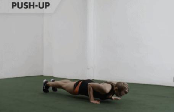 俯卧撑向下:将身体接近地面。(动作过程中保持躯干稳定,不要出现塌腰驼背的状况)