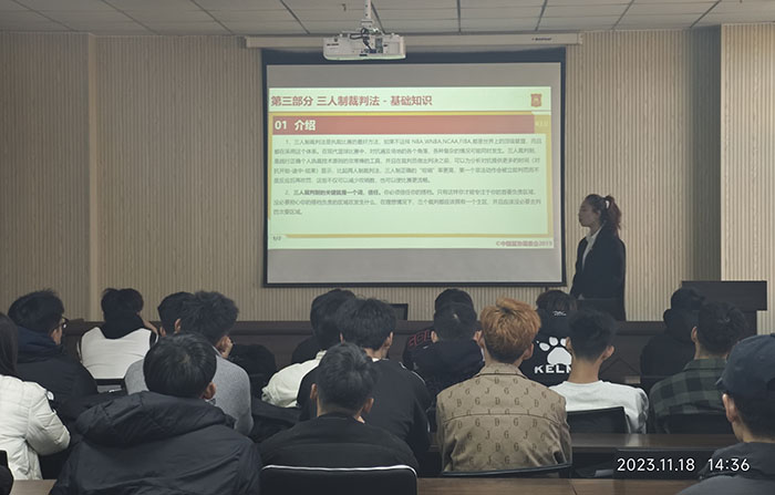 之后,由体育教育2102班邵明慧就裁判员等级简介及规则的基本精神、裁判员跑位选位、比赛官员的基本工作程序、犯规及不正当行为、裁判员体能测试介绍等内容进行培训,为同学们解读篮球比赛的详细规则,通过理论授课与动作示范相结合的方式,为大家示范正确的犯规、走步等吹罚姿势,使同学们对篮球比赛的基本规则、赛事秩序以及裁判员纪律有了更深入地了解,提升了对专业知识的掌握。