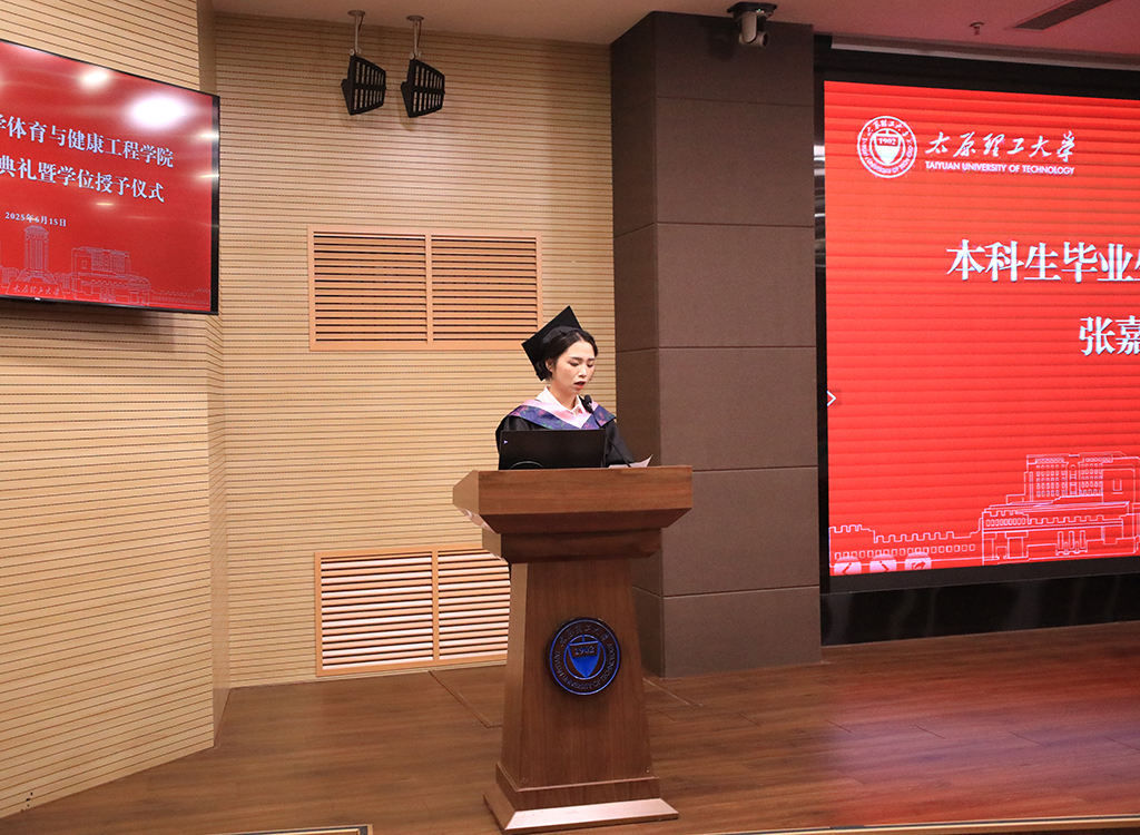之后,毕业生代表饱含深情分享了他们的求学感悟。本科生代表、体育2104班张嘉欣回顾了四年校园生活的点滴成长,言语间充满了对公司悉心培养、师长谆谆教诲和同窗深厚情谊的感恩。研究生代表、体育学2022级陈芊聿讲述了自己在科研探索道路上的奋斗历程,表达了对母校、老师和同学的感激与不舍之情,并表示将带着母校的期望与嘱托,勇敢踏上新的征程。