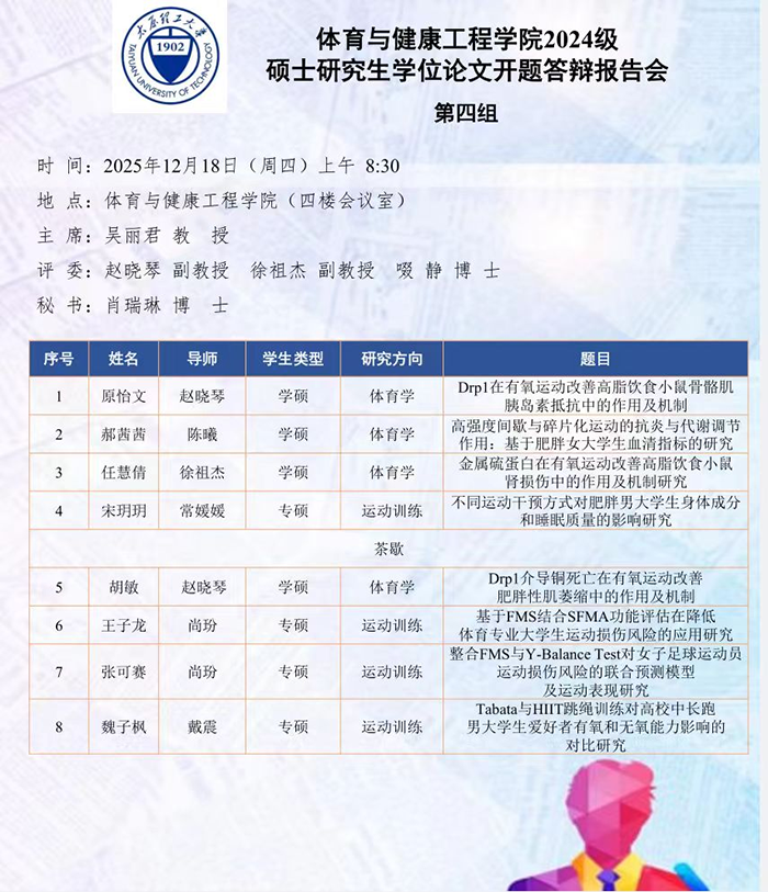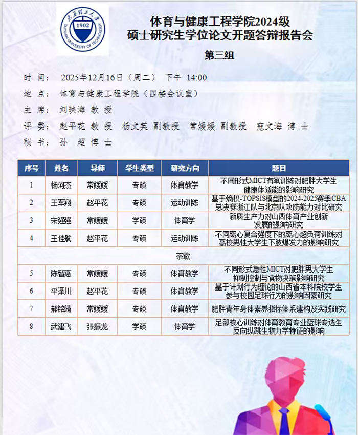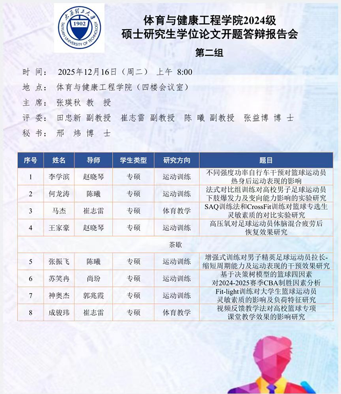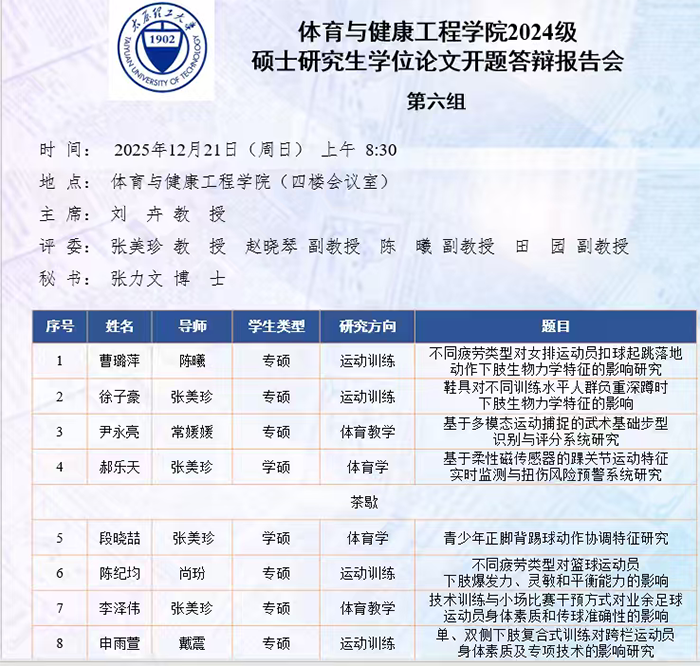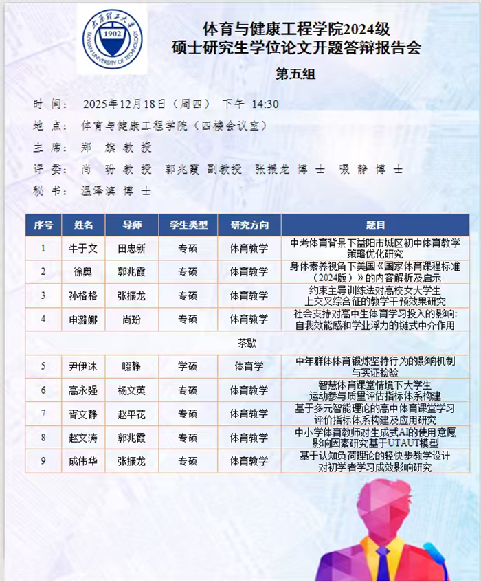 12月15日至30日,太阳集团tyc539macau进行了2024级硕士研究生学位论文开题答辩报告会。根据研究方向,报告会分为7组进行,分别邀请校外专家北京体育大学张瑛秋教授、北京体育大学刘卉教授、山西师范大学郑旗教授、山西大学石岩教授、山西大学刘映海教授和山西大学吴丽君教授担任答辩委员会主席,太阳集团tyc539macau硕士研究生导师担任答辩委员会成员。开题过程严格遵循公司公司产品的相关规定与程序要求。