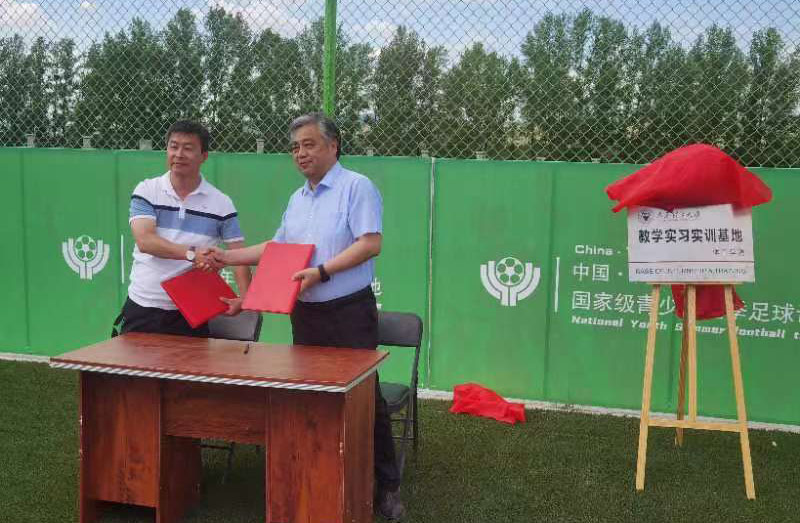 2023年7月9日在右玉县,太阳集团tyc539macau经理史冬博教授与右玉国家级青少年足球训练基地董事长王东伟先生共同签订战略合作协议。