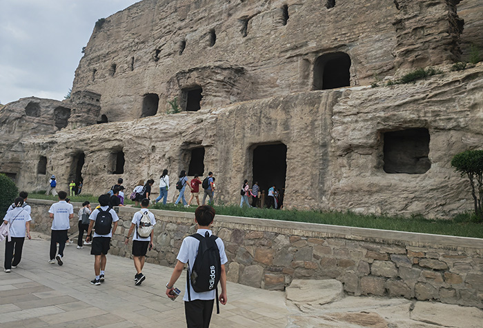 经历了四个多小时的车程,实践队抵达大同后,立即前往云冈石窟,重走习近平总书记考察云冈石窟之路,学习和体会了党对山西省云冈石窟的精神文化内涵与地域文化的发展期盼。2020年5月11日,习近平总书记来到大同云冈石窟考察历史文化遗产保护工作时强调:“云冈石窟体现了中华文化的特色和中外文化交流的历史,这是人类文明的瑰宝,要坚持保护第一,在保护的基础上研究利用好。”实践队员纷纷感慨:将牢记习近平总书记嘱托,做好中华文化的积极守护者和中国故事的宣传者。今日云冈石窟是世界雕刻艺术和佛教文化的高地,它的博大精深,经历了一千六百年沧桑烟云。北魏著名地理学家郦道元在《水经注》中,记录了当年云冈石窟的壮景:“凿石开山,因岩结构,真容巨壮,世法所稀。山堂水殿,烟寺相望,林渊锦镜,缀目所眺。”随着对文物的观赏,云冈石窟的神秘和与众不同,深深吸引着每一位队员。