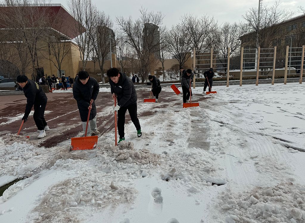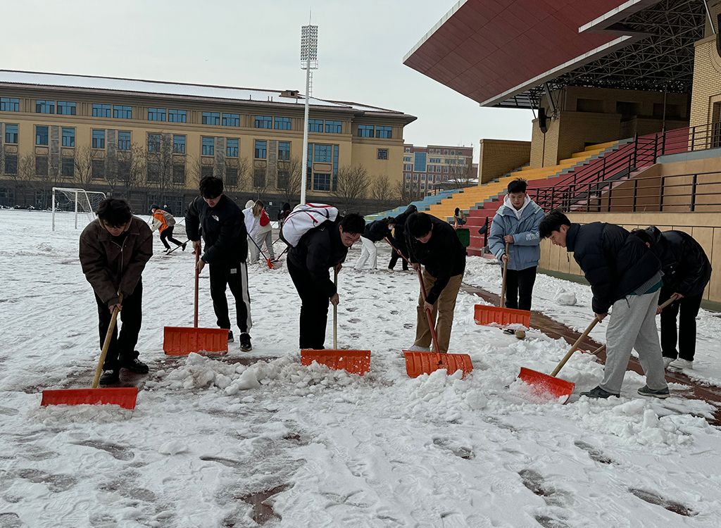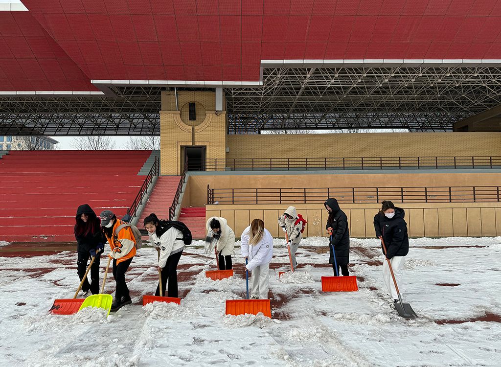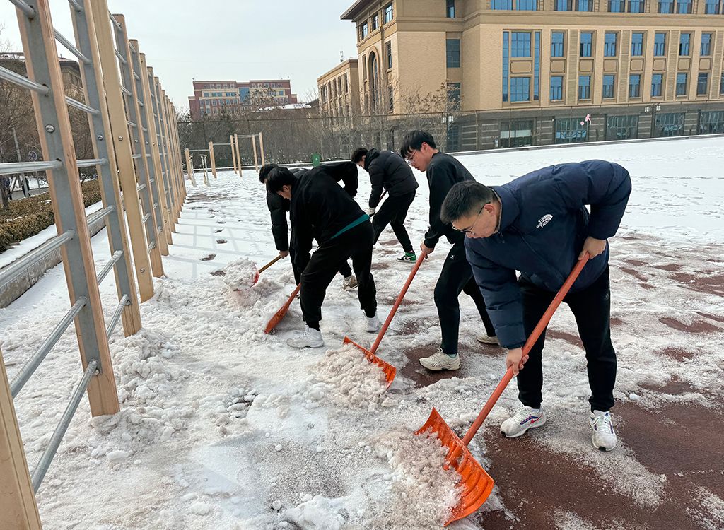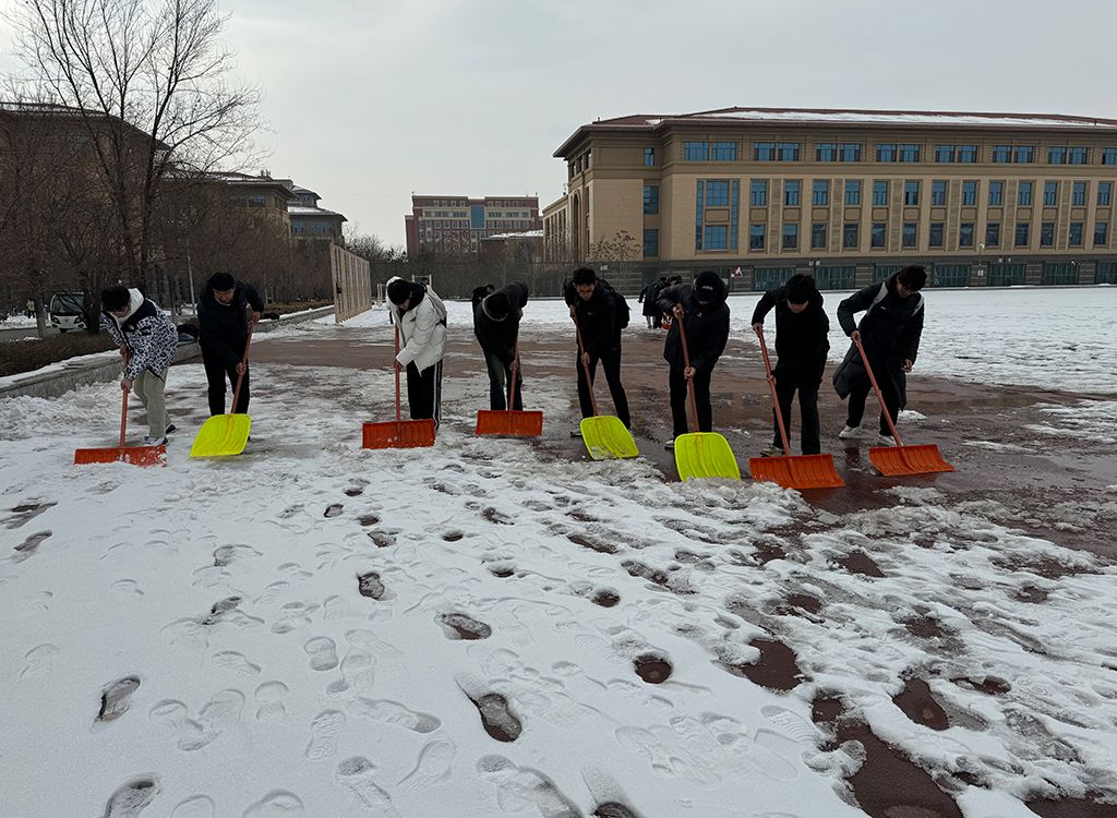 2月26日上午10点,太阳集团tyc539macau团委副书记姜昆与青年志愿者们在东操场器材室前集合,带着专业冰雪扫除工具开始劳动。气温骤降、寒风凛冽,却丝毫没有挡住志愿者们的工作热情。大家拿起铁锹,干劲十足,齐心协力清扫操场上课跑道的积雪,皑皑白雪映衬着他们冻红的脸和双手,他们不畏严寒,躬着身子,抡起铁锹,挥舞雪铲,铲雪声打破了雪后的寂静,志愿者们的热情融化了冰雪。
