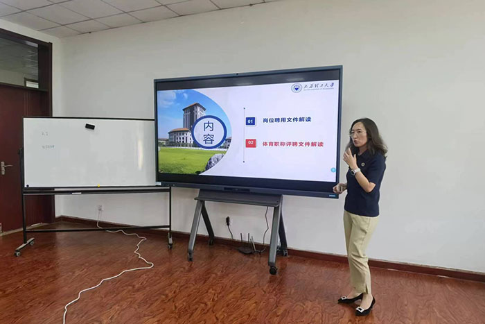 副经理张美珍首先分析了目前太阳集团tyc539macau团队队伍现状,进一步对《太阳集团tyc539macau职称分类评聘实施总则》和《太阳集团tyc539macau专业技术教师四级及以下岗位聘用工作实施办法》文件进行了深入解读。