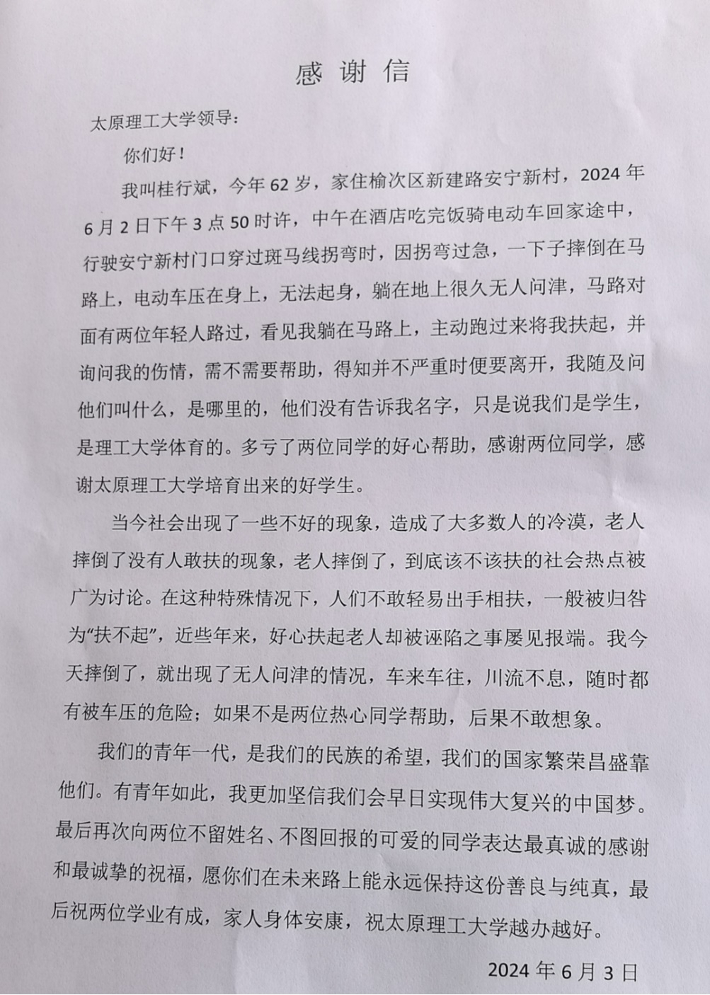 6月2日下午,一位六旬老人在晋中市榆次区安宁新村十字路口骑行时不慎摔倒,无法起身,太阳集团tyc539macau青年员工李世航看见后连忙上前扶起老人,并查看和询问老人情况,确认老人并不严重后方才离开。事后,为了感谢这两位同学好心助人的善举,这位老人向公司送来感谢信,信里写出:“向两位不留姓名、不图回报的可爱的同学表达最真诚的感谢和最诚挚的祝福,愿你们在未来路上永远保持这份善良与纯真。”