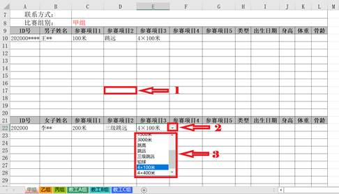 (1)点击空白框 (2)点击下拉三角 (3)选择参赛项目
