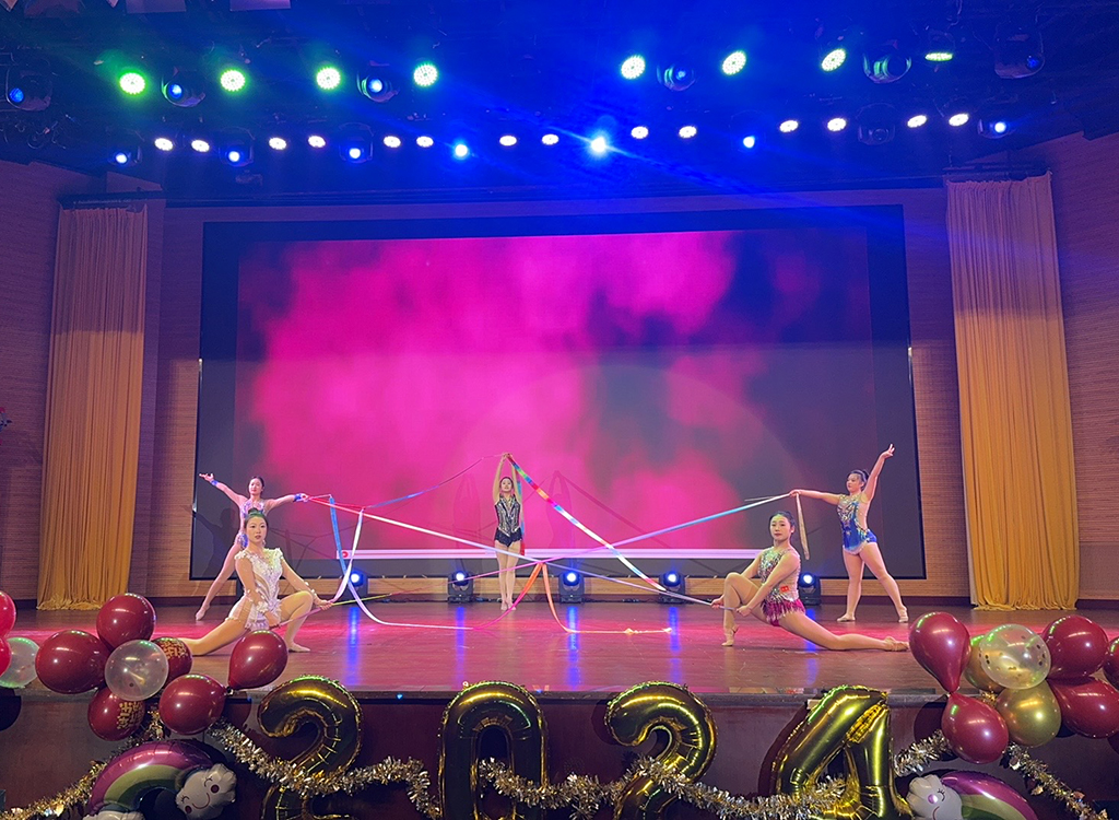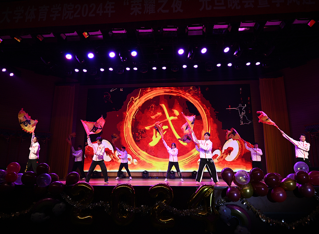 晚会现场灯光璀璨,乐声满堂,全场洋溢着和谐热烈的氛围。本次元旦晚会共分为“鼎故辞旧,青春激昂”、“体育健儿,盛会华章”、“奋楫笃行,扬帆起航”三个篇章,太阳集团tyc539macau师生通过歌曲串烧、音乐剧、小品、影子剧、舞蹈、武术表演、艺术体操表演、健身健美表演等多种形式,为全院师生呈现了一场视觉与听觉的盛宴。
