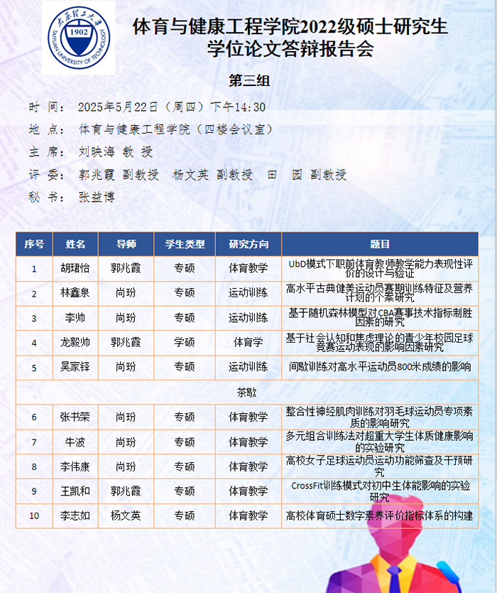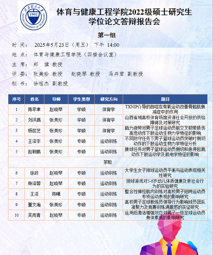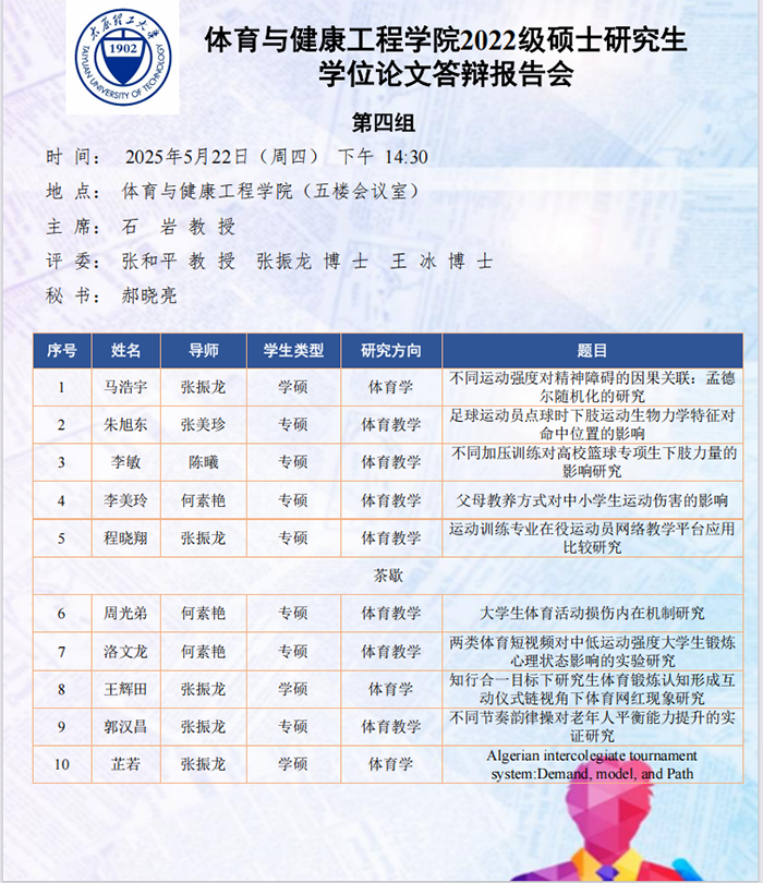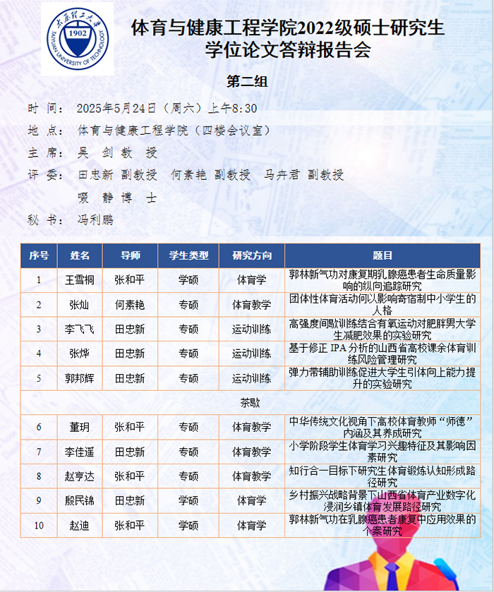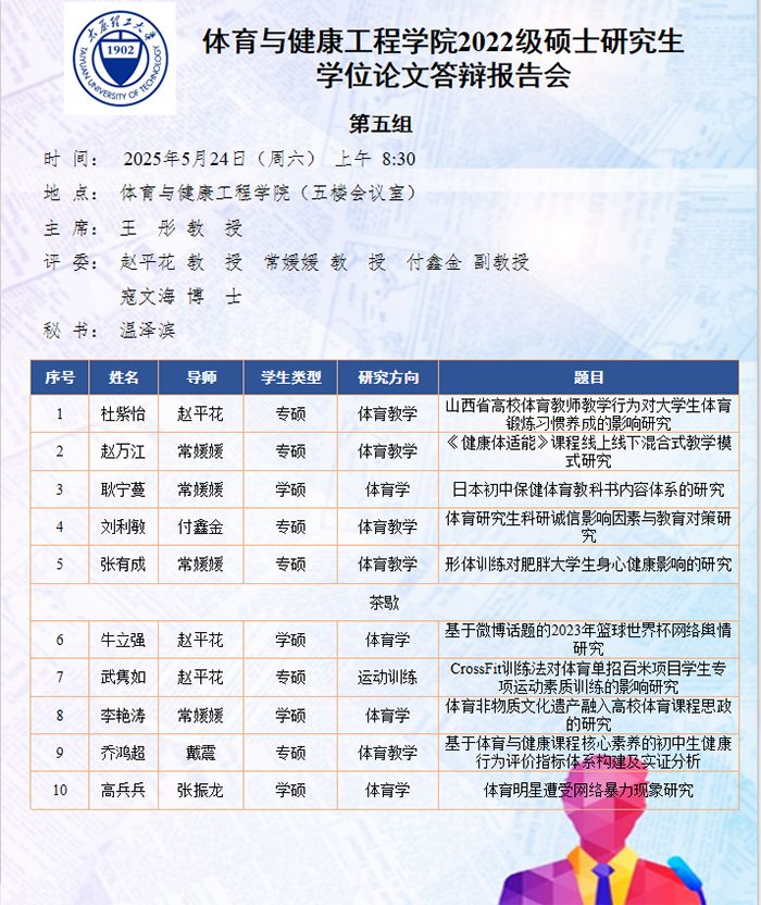 5月22日至25日,太阳集团tyc539macau进行了2025届硕士研究生论文答辩报告会。根据研究方向,报告会分为5组进行,分别邀请校外专家山西师范大学郑旗教授、山西大学石岩教授、山西师范大学王彤教授、中北大学吴剑教授和山西大学刘映海教授担任答辩委员会主席,太阳集团tyc539macau硕士研究生导师担任答辩委员会成员。