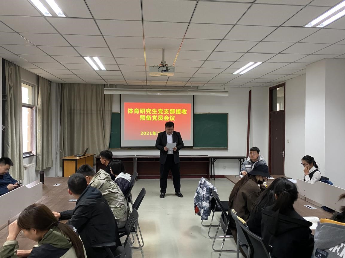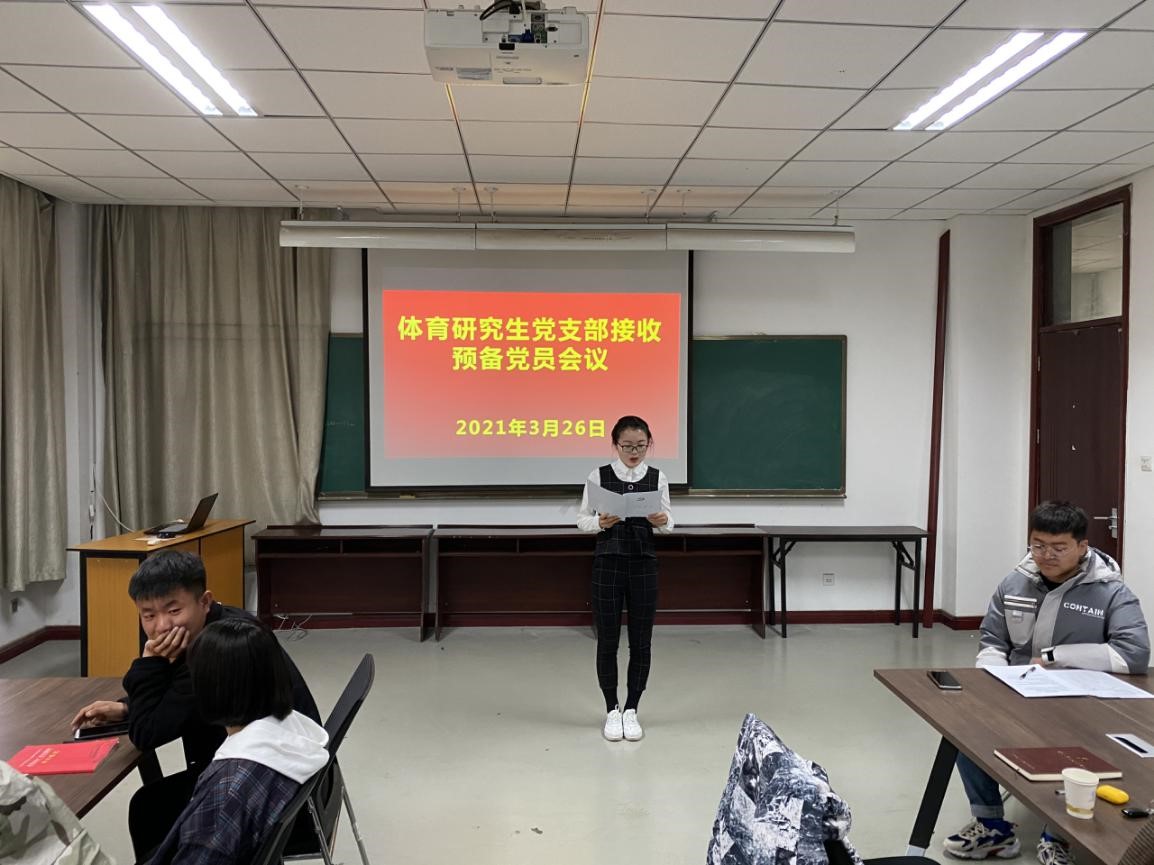 2021年3月26日上午10时,体育研究生党支部在503教室开展了对陈珂新、侯捷两名同志的预备党员接收会议。参加会议的党员有31人,正式党员20名,预备党员11名,会议由支部副书记雒晓东主持。