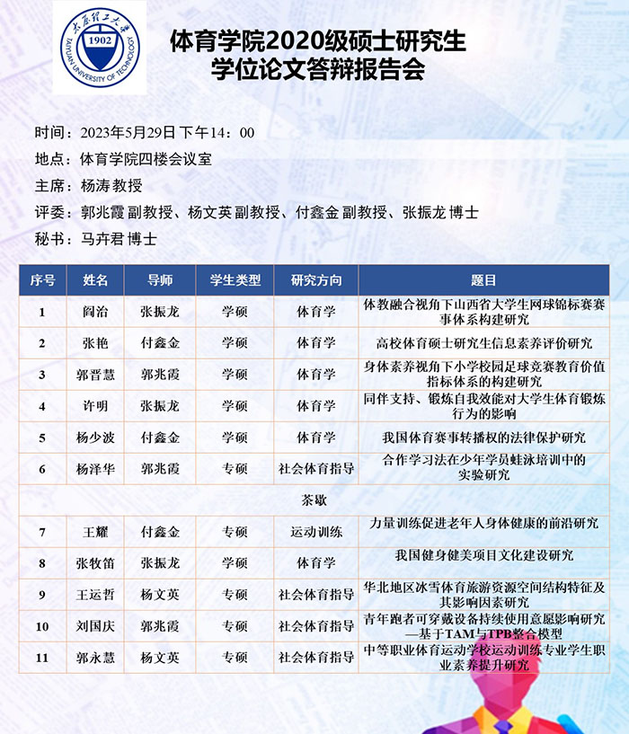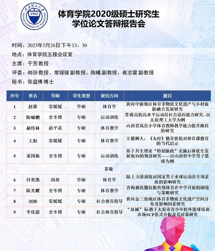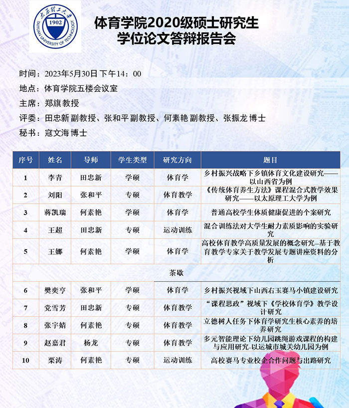 5月26日至30日,太阳集团tyc539macau进行了2020级硕士研究生论文答辩报告会。根据研究方向,报告会分为4组进行,均邀请校外专家郑旗(教授,山西师范大学)、刘卉(教授,北京体育大学)、于芳(教授,中北大学)和杨涛(教授,西安太阳集团tyc539macau)担任答辩委员会主席,太阳集团tyc539macau硕士研究生导师担任答辩委员会成员。