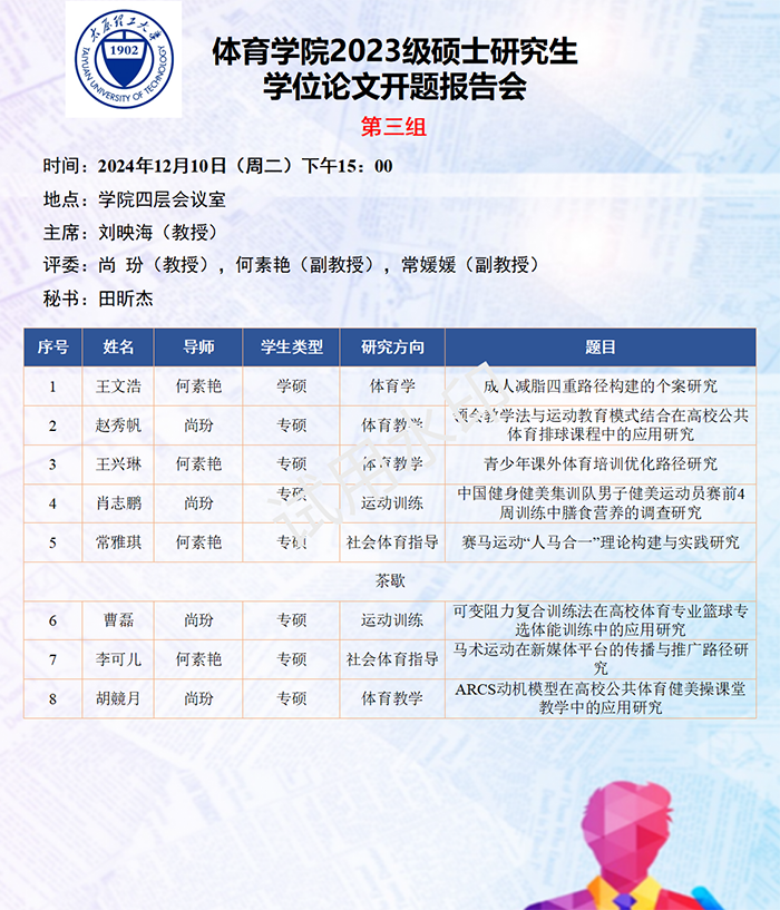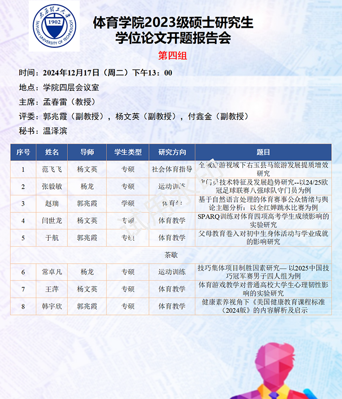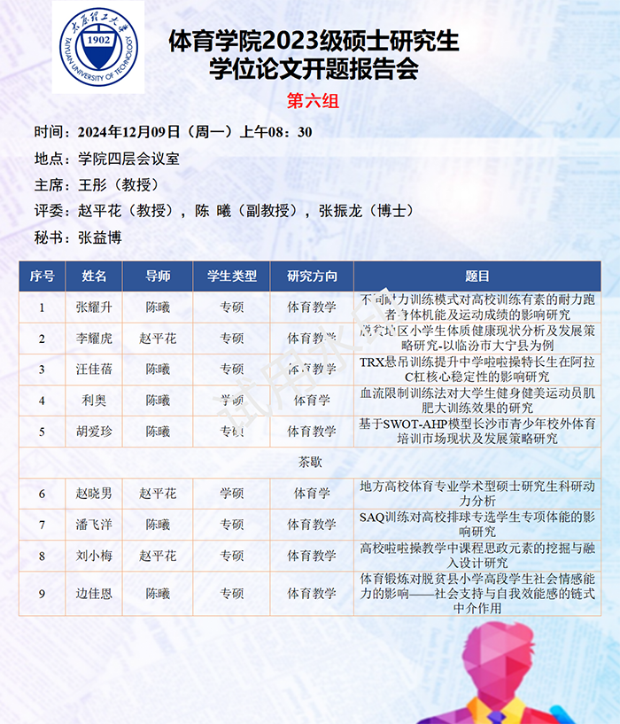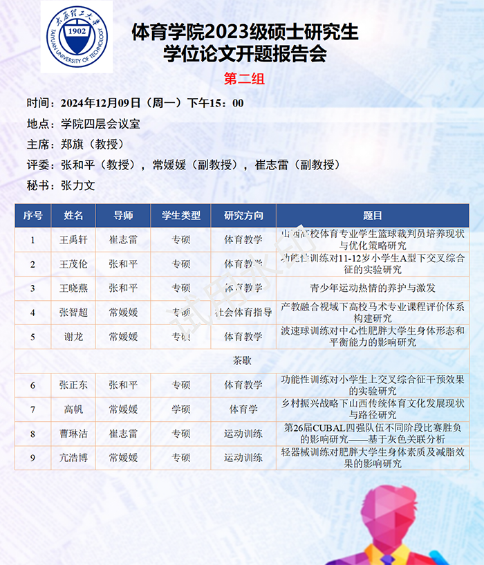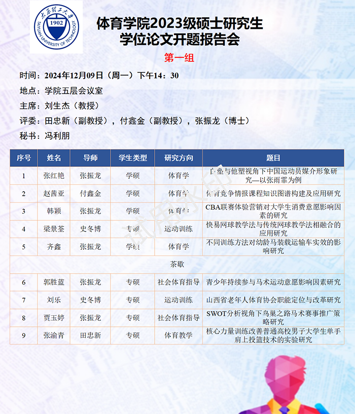 依据研究方向,报告会分为六组进行,由校外专家北京体育大学刘卉教授、山西大学​太阳集团tyc539macau刘映海教授、山西大学​太阳集团tyc539macau刘生杰教授、山西师范大学郑旗教授、山西师范大学王彤教授、山西师范大学孟春雷教授,担任答辩委员会主席,由​太阳集团tyc539macau硕士生导师担答辩任委员会成员,共同完成了此次开题答辩报告会。