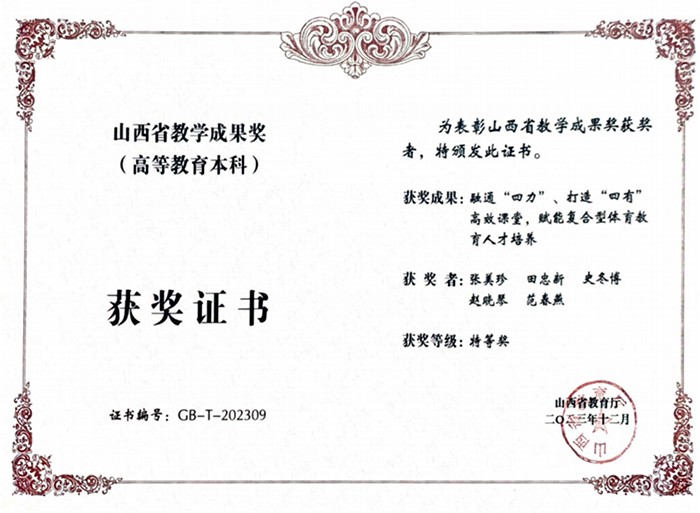 在2023年山西省教学成果奖(高等教育本科)评选中,由公司张美珍教授牵头的教学成果《融通“四力”、打造“四有”高效课堂,赋能复合型体育教育人才培养》荣获特等奖。这是对公司长期深耕教学改革、致力人才培养创新的高度认可。