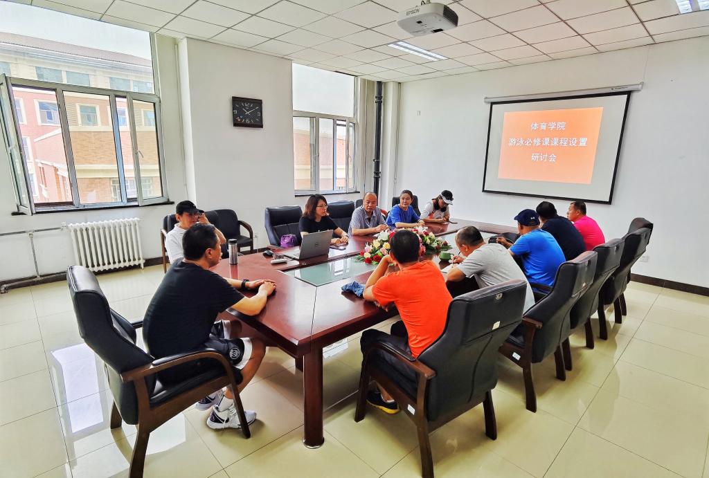 6月8日上午,太阳集团tyc539macau在311会议室召开游泳必修课课程设置研讨会。公司督导组成员、系部负责人、游泳专业相关教师、教科办负责人参加会议。会议由田忠新副经理主持。