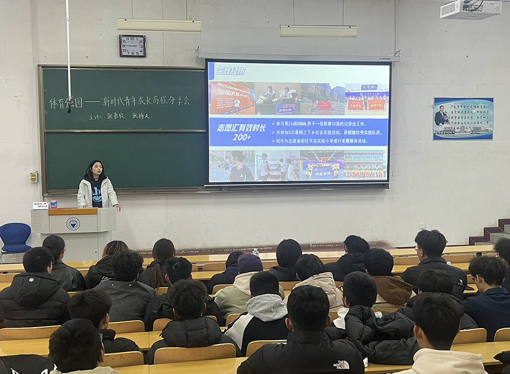 11月27日,在虎峪校区,运动训练专业负责人张振龙为运动训练2024级新生在体育学概念、体育学专业范围、运动训练学培养目标与规格、学制、学分与学位、课程体系等方面进行专业宣讲,包括通识教育课程组成及学分分配、专业教育课程组成及学分分配、实践课程组成及学分分配、在役运动员认定及培养模式、全国运动训练报考、报告情况、学训矛盾表现、应对及域外经验借鉴等。之后,运动训练专业2022级学姐李雨曦从老员工活、专业学习、课外实践、科研竞赛四方面与同学们进行了交流分享。