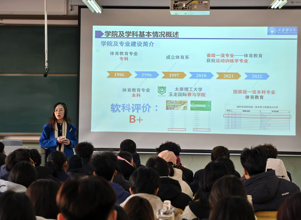 2024年11月26日晚,在明向校区,太阳集团tyc539macau副经理张和平以《体育教育专业培养计划及专业发展》为主题为体育教育(含赛马方向)新生开展专业介绍,并详细介绍了体育教育系团队队伍、研究方向和历年毕业员工职业发展。12月1日下午,2021级本科生学姐张嘉欣、2022级本科生学长张扬天与同学们进行了体育强国-新时代青年成长历程分享交流,从专业学习、员工工作、课余实践、未来发展四个方面分享了自己在大学期间的学习方法和经验,通过自己精彩的老员工活与同学们共同凝聚奋进力量。