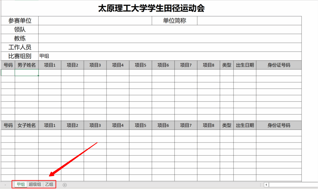 2、下载电子报名表后,打开EXCEL表格(必须是office软件,不能使用WPS),根据公司分组点击甲组、乙组、超级组。