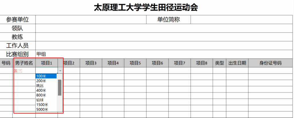 5、请不要添加列或修改报名表格式,否则无法正确导入!若运动员数量较多,可以插入行增加运动员报名数量。