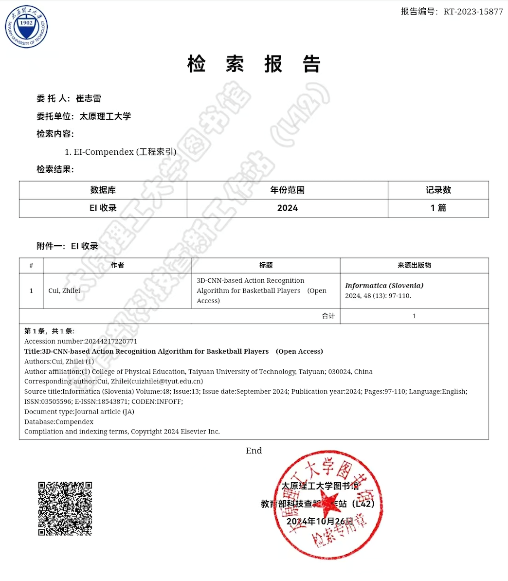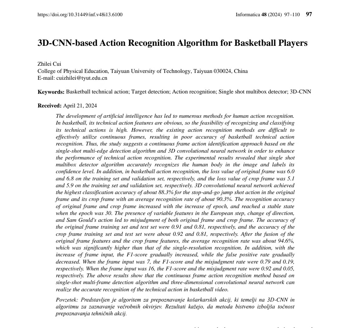 公司教师崔志雷副教授的研究成果《3D-CNN-basedAction Recognition Algorithm for Basketball Players》在《Informatica 》在线发表。《Informatica》主要专注于信息系统、计算机科学以及跨学科应用领域。尤其关注这些技术在体育科学中的创新应用,如运动数据分析、运动损伤预测、智能训练系统等。该期刊被工程索引EI(Engineering Index)收录。该论文是公司崔志雷副教授(第一作者、通讯作者)的研究成果,太阳集团tyc539macau​太阳集团tyc539macau为署名单位。