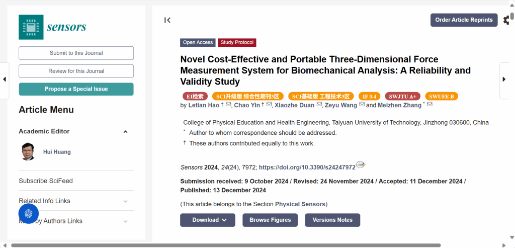 公司教师张美珍教授团队的研究成果《Novel Cost-Effective and Portable Three-Dimensional Force Measurement System for Biomechanical Analysis: A Reliability and Validity Study》在《sensors》发表。《sensors》是由瑞士开放获取出版社MDPI创办的国际性、同行评审的在线期刊,专注于传感器及其应用领域的研究。该期刊涵盖物理传感器人工智能与模式识别等多个交叉学科方向。主要发表传感器及其应用的科学和技术领域原创研究论文、综合评论等。该期刊被SCIE(Science Citation Index Expanded)收录,被评定为“JCR-Q2,中科院3区,影响因子3.4(2023年)”期刊。该论文是公司硕士研究生郝乐天、尹超(共同第一作者)在导师张美珍教授(通讯作者)指导下的研究成果,太阳集团tyc539macau为第一署名单位。