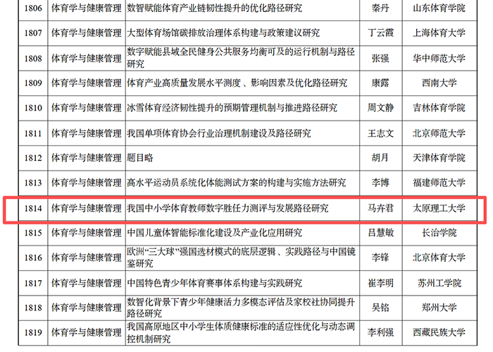 9月5日,全国哲学社会科学工作办公室公示了2025年国家社会科学基金年度项目立项名单,公司教师马卉君申报的《我国中小学体育教师数字胜任力测评与发展路径研究》课题获批青年项目,实现当年立项新突破。