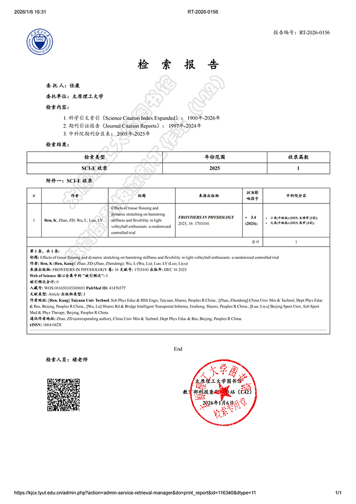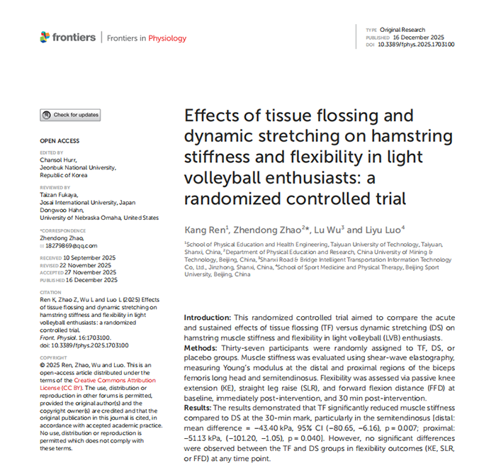公司教师任康的研究论文《Effects of tissue flossing and dynamic stretching on hamstring stiffness and flexibility in light volleyball enthusiasts: a randomized controlled trial》在《Frontiers in Physiology》期刊在线发表。《Frontiers in Physiology》是生理学领域的国际权威期刊,专注于发表生理学及相关交叉学科的高质量原创研究,该期刊被SCIE(Science Citation Index Expanded)数据库收录,被评为“JCR-Q1,中科院3区”期刊,影响因子为3.4。该论文是公司教师任康(第一作者)、中国矿业大学(北京)副教授赵振东(通讯作者)、山西路桥智慧交通信息科技有限公司武璐、北京体育大学骆立宇的合作成果,太阳集团tyc539macau为第一署名单位。