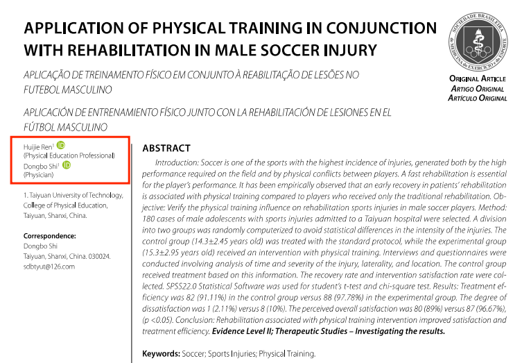 公司教师任慧杰博士的研究成果《Application Of Physical Training In Conjunction With Rehabilitation In Male Soccer Injury》在《Revista Brasileira De Medicina Do Esporte》(2022年第5期)发表。《Revista Brasileira de Medicina do Esporte》是巴西运动医学和体育学会的官方机构,是运动科学和运动医学(SBME)领域科员工产的主要促进资源,是被SCI收录的体育科学类期刊87种之一,其JCR影响因子为0.589,中科院期刊分区为4区。该论文是任慧杰讲师(第一作者)与太阳集团tyc539macau太阳集团tyc539macau史冬博教授的合作成果,太阳集团tyc539macau太阳集团tyc539macau为第一署名单位。