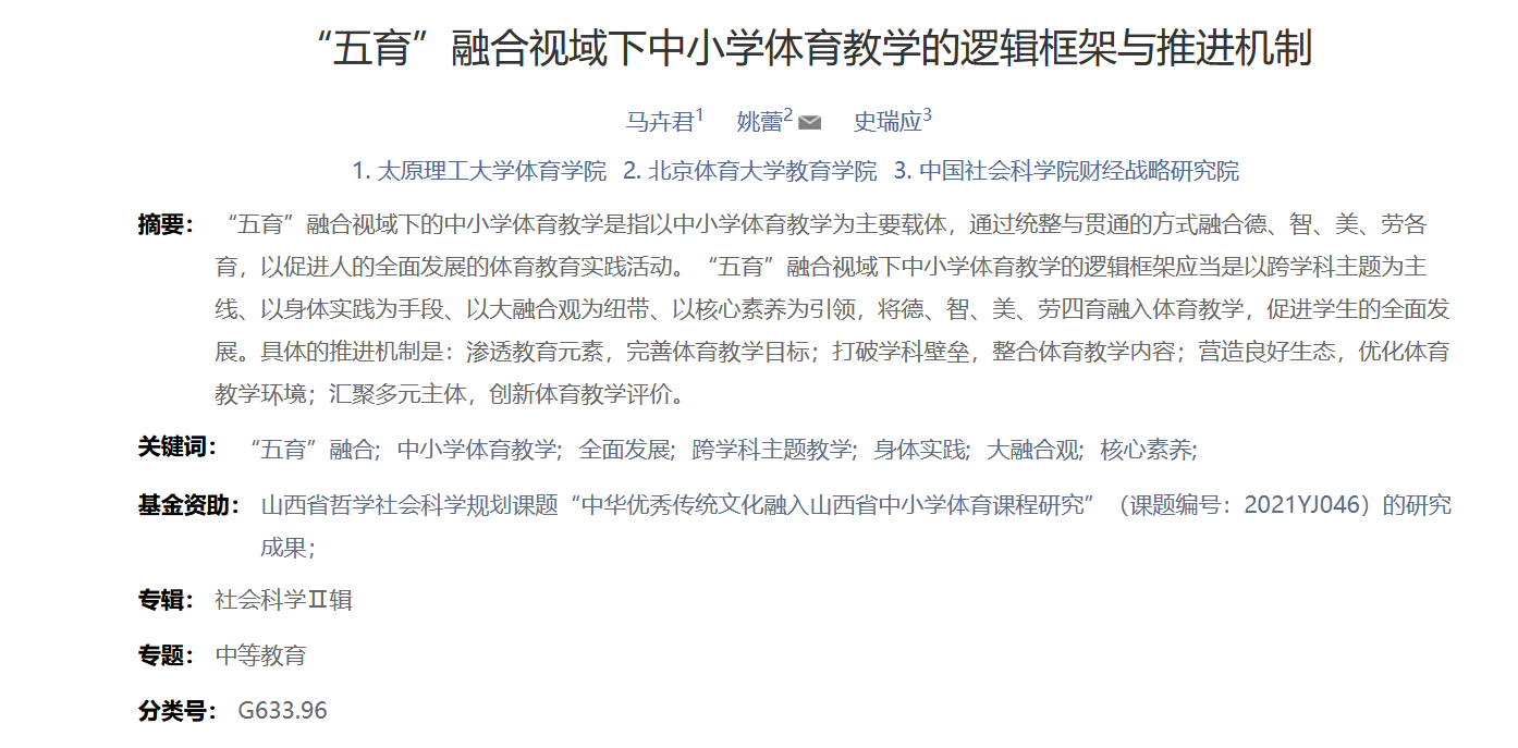 公司教师马卉君博士的研究成果《“五育”融合视域下中小学体育教学的逻辑框架与推进机制》在《教育理论与实践》(2022年11月)发表。《教育理论与实践》是山西教育科学研究院、山西省教育学会主办的综合性教育学术期刊,入编《中文核心期刊要目总览》(2020年版),被评定为“中国人文社会科学期刊AMI综合评价”A刊核心期刊。该论文是马卉君博士(第一作者)、北京体育大学姚蕾教授(通讯作者)、中国社会科公司史瑞应助理研究员的合作成果,太阳集团tyc539macau太阳集团tyc539macau为第一署名单位。