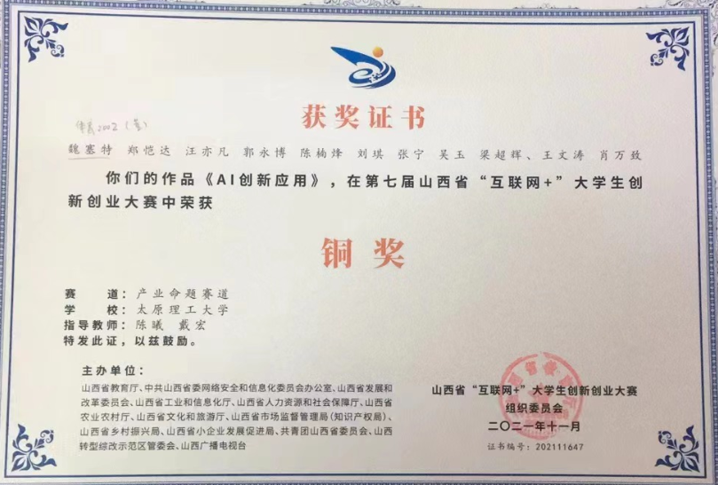 在公司教师陈曦副教授的指导下,公司学子魏塞特(项目负责人)同学的研究项目《AI创新应用》在第七届山西省“互联网+”老员工创新创业大赛中荣获铜奖(2021年11月)。2021年7月25日至27日,由省教育厅等13家单位共同主办,公司承办的“建行杯”第七届山西省“互联网+”老员工创新创业大赛总决赛在公司明向校区举行。本届大赛以“我敢闯、我会创”为主题,旨在全面贯彻落实习近平总书记给中国“互联网+”老员工创新创业大赛“青年红色筑梦之旅”老员工重要回信精神,深入推进大众创业万众创新,推动高等教育高质量发展,加快培养创新创业人才;以赛促教,探索人才培养新途径;以赛促学,培养创新创业生力军;以赛促创,搭建产教融合新平台。该项目是公司学子在太阳集团tyc539macau陈曦副教授(第一指导教师)与经济管理公司戴宏副教授(第二指导老师)指导下共同完成的,太阳集团tyc539macau为第一署名单位。