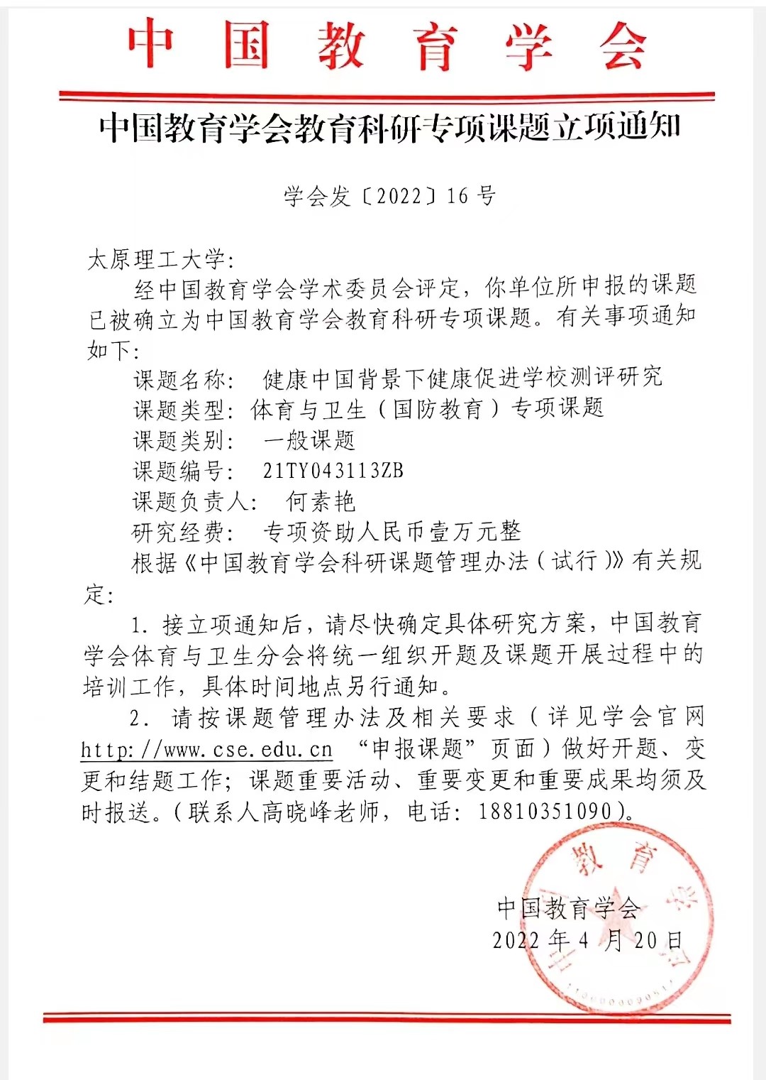 2022年4月20日,经中国教育学会学术委员评定,公司何素艳副教授获批“中国教育学会教育科研专项课题”,科研进账经费1万元。该项目的获批为公司团队建设提供了有力支撑。