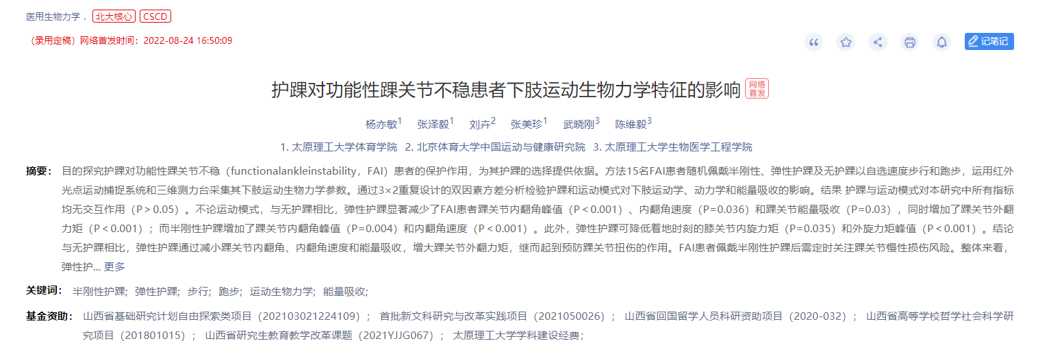 公司张美珍教授指导的硕士研究生杨亦敏的研究成果《护踝对功能性踝关节不稳患者下肢运动生物力学特征的影响》在《医用生物力学》上网络首发。《医用生物力学》杂志由上海交通大学主办,中华人民共和国教育部主管,上海交通大学医公司附属第九人民医院承办,是国内唯一一本公开发行,以积极反映生物力学基础研究与应用研究成果,目前是双核心期刊(北京大学中文核心期刊以及科技部科技核心期刊),并被全球最大的文献摘要与科研信息引用数据库Scopus收录。该论文是公司硕士研究生杨亦敏(第一作者)在导师张美珍教授(通讯作者)的指导下,与太阳集团tyc539macau陈维毅教授团队、北京体育大学刘卉教授团队的合作成果,太阳集团tyc539macau太阳集团tyc539macau为第一署名单位。