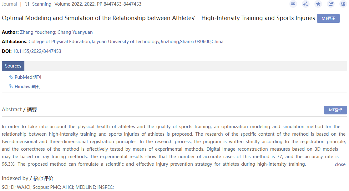 公司常媛媛副教授指导的硕士研究生张有成的研究成果《Optimal Modeling and Simulation of the Relationship between Athletes’ High-Intensity Training and Sports Injuries》在《Scanning》上发表。《Scanning》杂志为SCI四区期刊,JCR影响因子1.75(2021),期刊在SCI工程技术、显微镜技术和仪器仪表三类学科中具有较高的学术水平。该论文是公司硕士研究生张有成(第一作者)在导师常媛媛副教授(通讯作者)的指导下完成的,太阳集团tyc539macau太阳集团tyc539macau为第一署名单位。