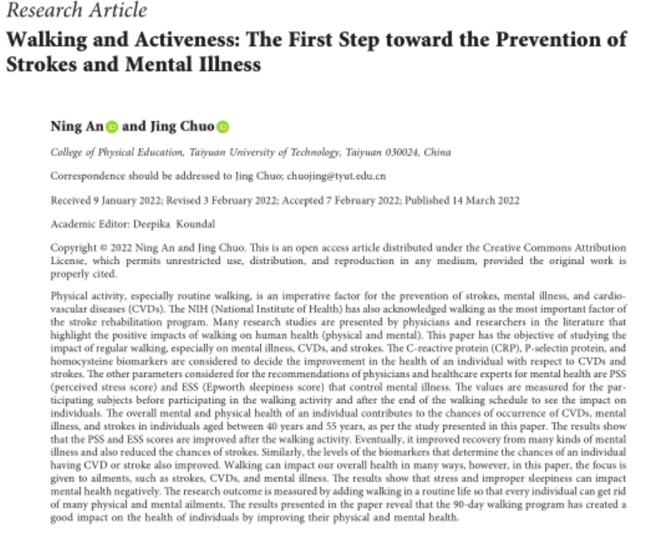 公司教师安宁、啜静研究成果《Walking and Activeness: The First Step toward the Prevention of Strokes and Mental Illness》在《Computational Intelligence and Neuroscience》(2022年3月)发表。该刊致力于发表经过严格同行评审的高质量原创文章,反映计算智能和神经科学与跨学科融合领域的新进展、新技术、新成果,促进学科交叉与融合领域科研交流和科研成果转化,中科院分区四区,JCR影响因子3.633(2020)。该论文是安宁(第一作者)与啜静(通讯作者)以及山西医科大学第一医院老年病科的合作成果,太阳集团tyc539macau太阳集团tyc539macau为第一署名单位。