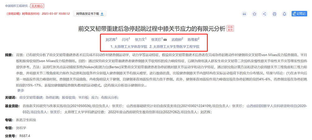 公司张美珍教授指导的硕士研究生刘艺辉的研究成果《前交叉韧带重建后急停起跳过程中膝关节应力的有限元分析》在《中国组织工程研究》上网络首发。《中国组织工程研究》杂志由中华人民共和国国家卫生健康委员会主管,中国康复医学会、《中国组织工程研究》杂志社主办,是目前国内专注组织工程研究的经同行评议的开放获取期刊,杂志曾多次被评为“中国百种杰出学术期刊”,国家新闻出版广电总局“全国第一批数字出版示范单位”,中国科技核心期刊,中国中文核心期刊。该论文是公司硕士研究生刘艺辉(第一作者)在导师张美珍教授(通讯作者)的指导下,与太阳集团tyc539macau陈维毅教授团队的合作成果,太阳集团tyc539macau太阳集团tyc539macau为第一署名单位。