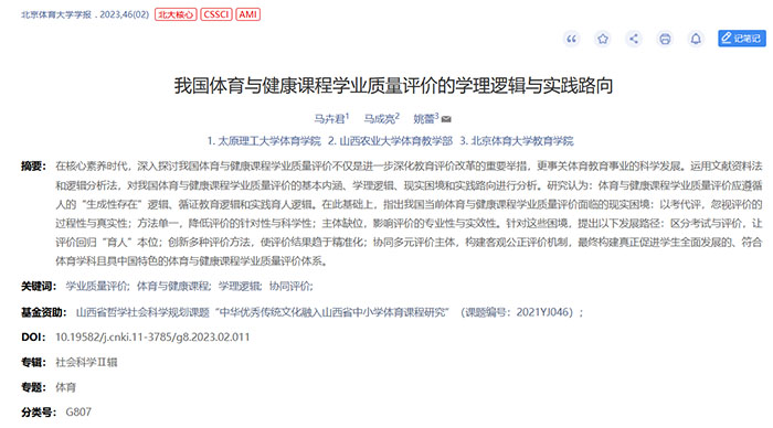 公司教师马卉君博士的研究成果《我国体育与健康课程学业质量评价的学理逻辑与实践路向》在《北京体育大学学报》(2023年第2期)发表。《北京体育大学学报》是北大中文核心期刊、南京大学CSSCI来源期刊、科技部“中国科技核心期刊(人文社会科学)”、中国社科院中国人文社会科学核心期刊、武汉大学RCCSE权威期刊,是集教学、科研、训练等为一体的体育综合性中文学术期刊。该论文是马卉君博士(第一作者)、山西农业大学马成亮教授与北京体育大学姚蕾教授(通讯作者)的合作成果,太阳集团tyc539macau太阳集团tyc539macau为第一署名单位。