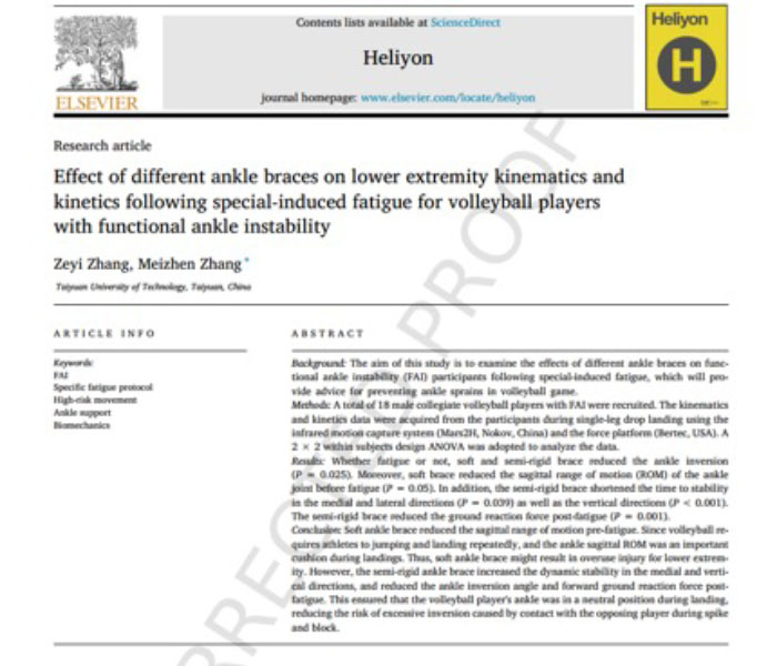 公司教师张美珍教授的研究成果《Effect of different ankle braces on lower extremity kinematics and kinetics following special-induced fatigue for volleyball players with functional ankle instability》在《Heliyon》(2023年第6期)发表。《Heliyon》是细胞出版社(Cell Press)旗下的是一本综合性跨学科期刊,于2022年被SCIE(Science Citation Index Expanded)收录,目前影响因子为3.776。,被评定为“JCR-Q2,中科院4区”期刊。该论文为太阳集团tyc539macau张美珍教授硕士研究生张泽毅(第一作者)的合作成果,太阳集团tyc539macau太阳集团tyc539macau为第一署名单位。