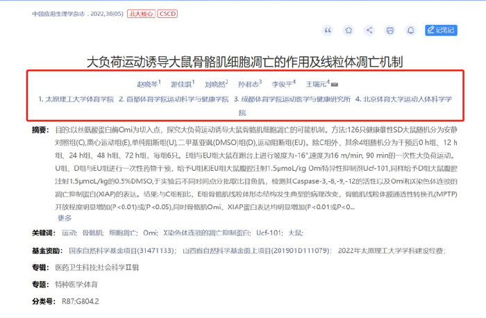 公司教师赵晓琴副教授的研究成果《大负荷运动诱导大鼠骨骼肌细胞凋亡的作用及线粒体凋亡机制》在《中国应用生理学杂志》(2022年第5期)发表。《中国应用生理学杂志》是中国生理学会、军事医学科公司和卫生学环境医学研究所主办的学术期刊,于1985年经新闻总署批准的正规刊物,被评定为“中国科技核心期刊、CSCD中国科学引文数据库来源期刊、北京大学《中文核心期刊要目总览》来源期刊,同时被国内外多个科技期刊检索系统或数据库收录。该论文是赵晓琴副教授(第一作者)与北京体育大学王瑞元教授的合作成果,太阳集团tyc539macau太阳集团tyc539macau为第一署名单位。