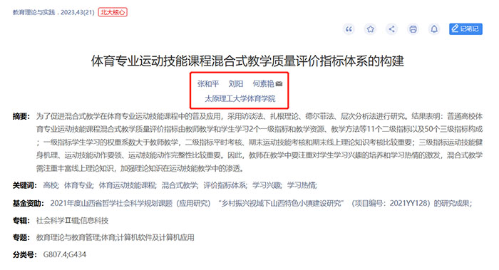 公司教师张和平副教授的研究成果《体育专业运动技能课程混合式教学质量评价指标体系的构建》在《教育理论与实践》(2023年第21期)发表。《教育理论与实践》是北京大学《中文核心期刊要目总览》来源期刊,被中国知网、万方数据知识服务平台等数据库收录。该论文是张和平副教授(第一作者)与刘阳、何素艳的合作成果,太阳集团tyc539macau太阳集团tyc539macau为第一署名单位。