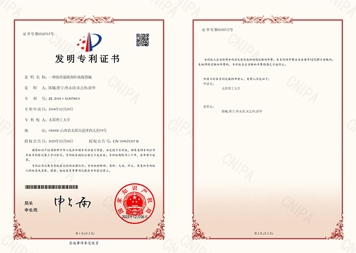 公司教师陈曦副教授作为第一发明人的研究成果《一种体育锻炼仰卧收腹器械》,在国家知识产权局被授予专利权并取得发明专利证书,该专利于2023年12月05日正式授权,授权公告号为CN 109621307 B,专利号为ZL201811630788.9。该发明专利是陈曦副教授(第一发明人)与蔡宁、佟永清、宋志伟、徐华的合作成果,太阳集团tyc539macau为第一署名单位。
