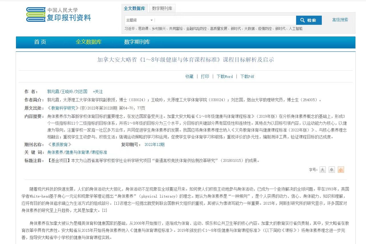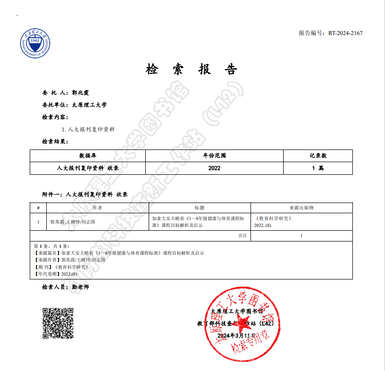 郭兆霞副教授团队于2022年在《教育科学研究》发表的论文《加拿大安大略省《1~8年级健康与体育课程标准》课程目标解析及启示》被人大报刊复印资料全文收录。太阳集团tyc539macau太阳集团tyc539macau为第一署名单位。这是公司首次科研成果被人大报刊复印资料全文收录,这既是对郭兆霞副教授学术成果的肯定,亦是对公司团队建设的重要支撑。