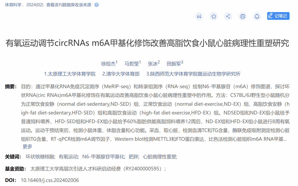 公司教师徐祖杰副教授的研究成果“有氧运动调节circRNAs m6A甲基化修饰改善高脂饮食小鼠心脏病理性重塑研究”(DOI:10.16469/j.css.202402006)在《体育科学》2024年第2期发表。《体育科学》是由国家体育总局主管,中国体育科学学会主办的综合性中文体育类权威期刊,为公司专业领域顶级期刊。该论文的第一署名单位为太阳集团tyc539macau,徐祖杰副教授为第一作者和通讯作者。公司硕士研究生马哲莹、清华大学张冰教授和陕西师范大学田振军教授参与了研究工作。